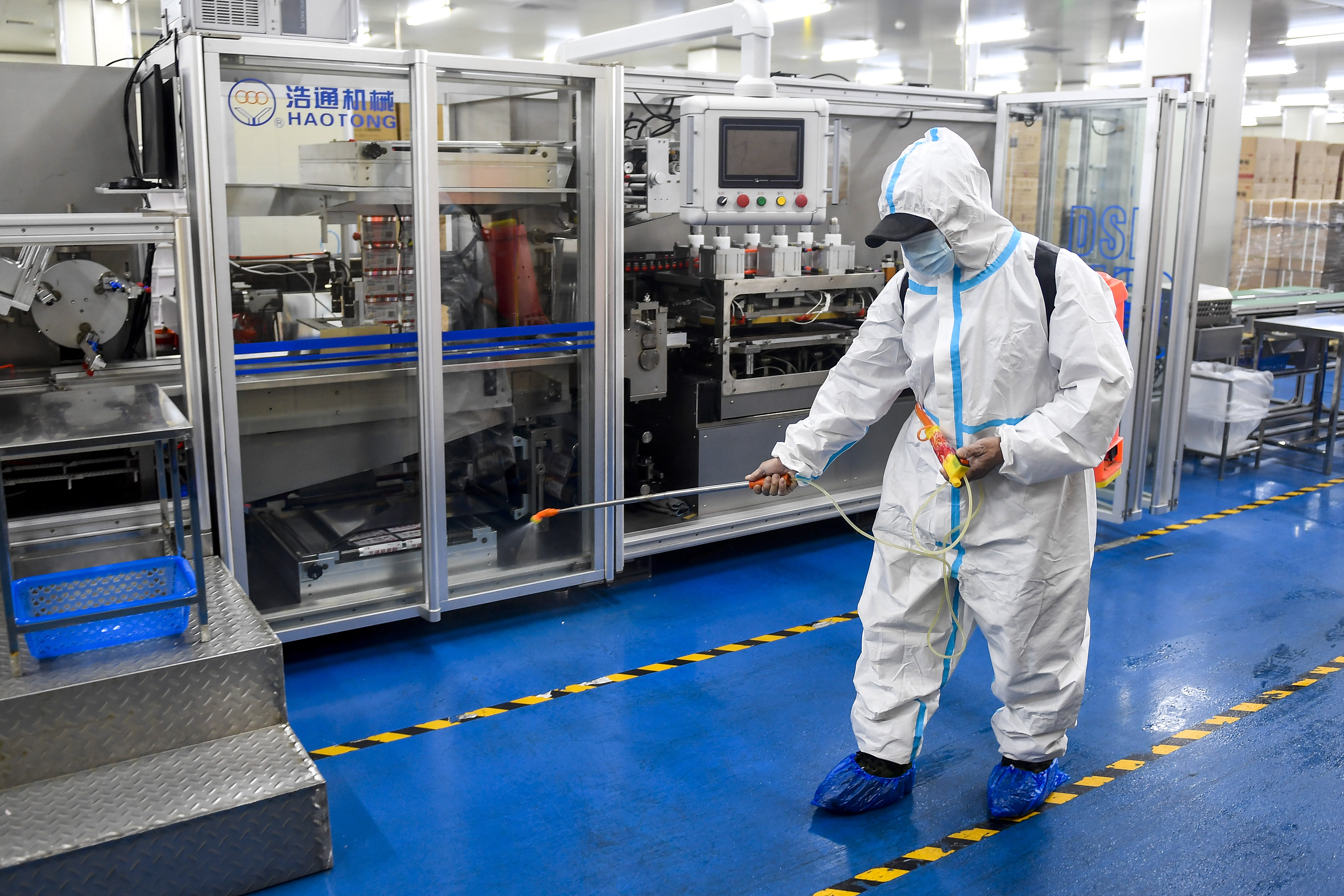 2月15日,在吉林省通化市万通药业股份有限公司,工作人员在车间内进行消杀。新华社记者许畅 摄