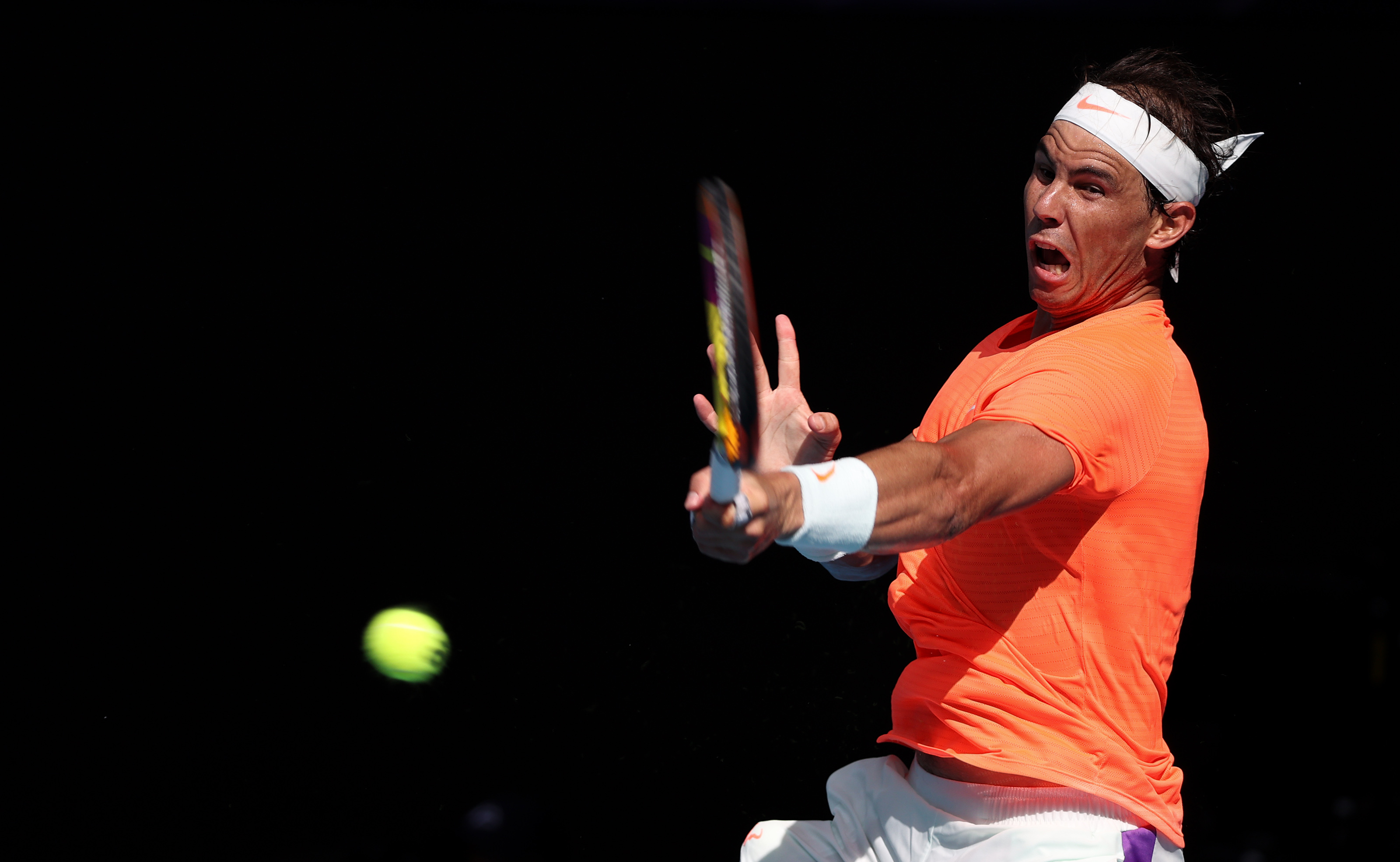 2月15日,西班牙选手纳达尔在比赛中回球。新华社记者 白雪飞 摄