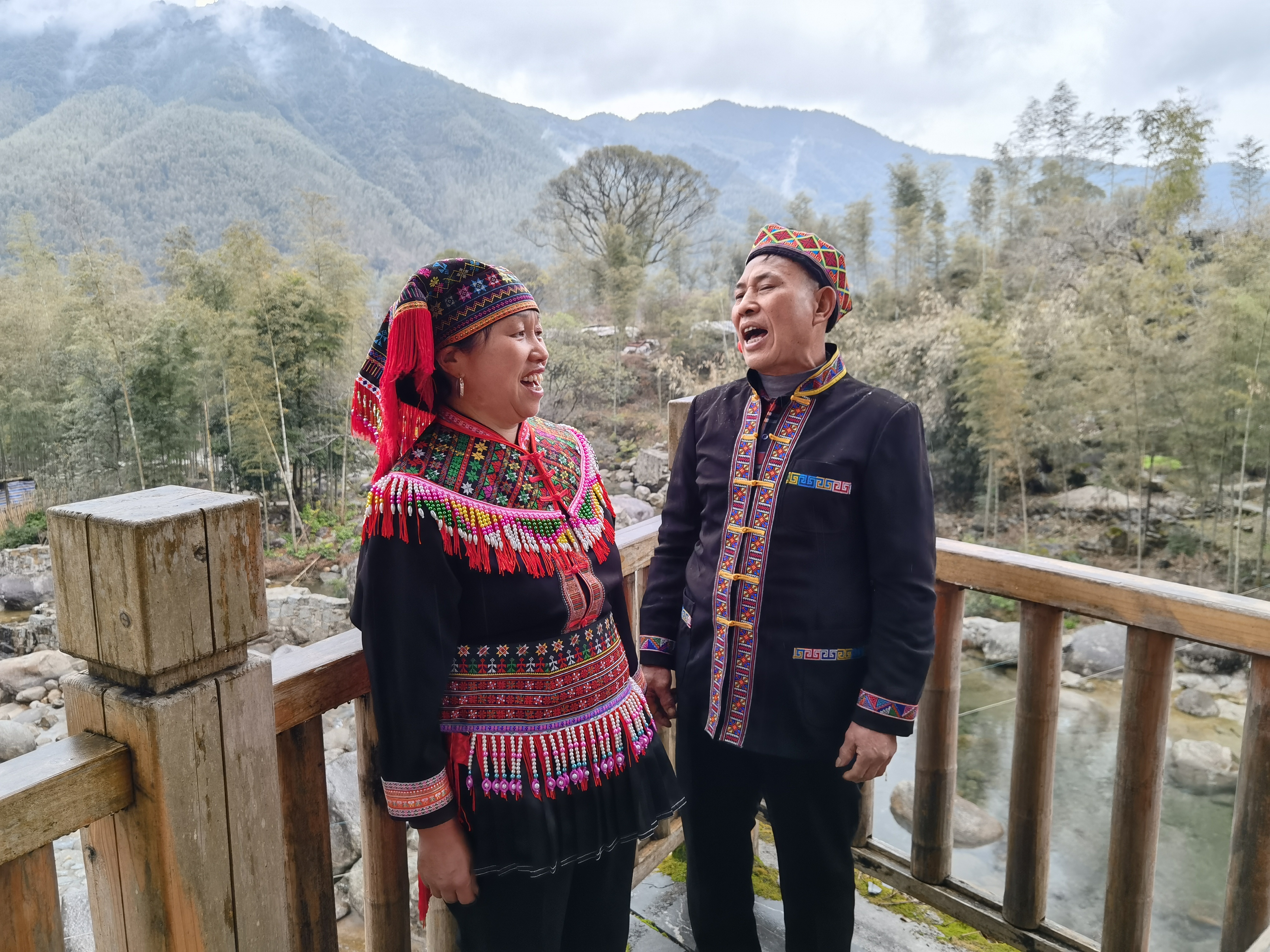 这是邓凤志(右)与爱人对唱瑶族传统山歌(2月9日摄)。新华社记者卢羡婷摄