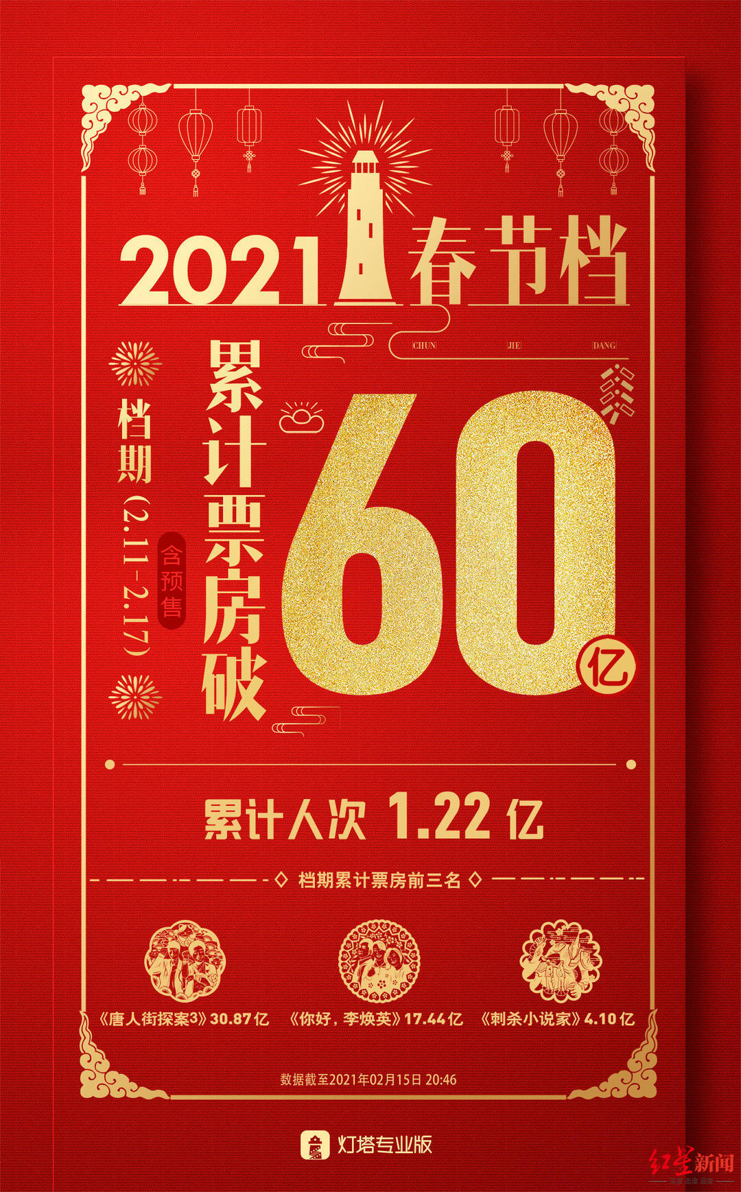 据灯塔实时数据,2月15日晚20时46分,2021春节档期内(2月11-17日)总票房(含预售)破60亿元,继续刷新春节档票房影史纪录。《唐人街探案3》以近31亿暂列春节档总票房第一,《你好,李焕英》超过17亿排在第二,第三名《刺杀小说家》达4.1亿。
