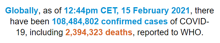 根据世卫组织最新实时统计数据,截至欧洲中部时间2月15日12时44分(北京时间2月15日19时44分),全球累计新冠肺炎确诊病例108484802例,累计死亡病例2394323例。(总台记者 朱赫)