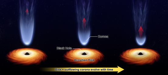 冕在黑洞吸积过程中如何运动尚不明确。对同时期MAXIJ1820+070的X射线时变分析显示,当X射线辐射流强逐渐下降时,冕的几何尺度趋向黑洞收缩。而越靠近黑洞,引力弯曲效应越强,吸积盘相对于冕的张角越大,冕辐射出的X射线光子本应有更大比例照射到吸积盘上,增强冕对吸积盘的照射,而这和研究团队对慧眼观测数据的分析结果相反。研究团队指出,目前这一现象最合理的解释是:冕在收缩的同时,冕中的等离子体流正在以相对论速度向外运动,这为慧眼团队已经发现的离黑洞很近的相对论喷流提供了独立的观测证据和物理解释。研究团队进一步发现,冕尺度越小,速度越大,因此冕物质运动的相对论性集束效应抑制了黑洞的引力弯曲效应。此研究成果第一次系统地描绘了黑洞X射线双星在爆发过程中,等离子体流逃离黑洞引力场的速度演化,对于理解黑洞吸积过程和相对论效应具有重要意义。