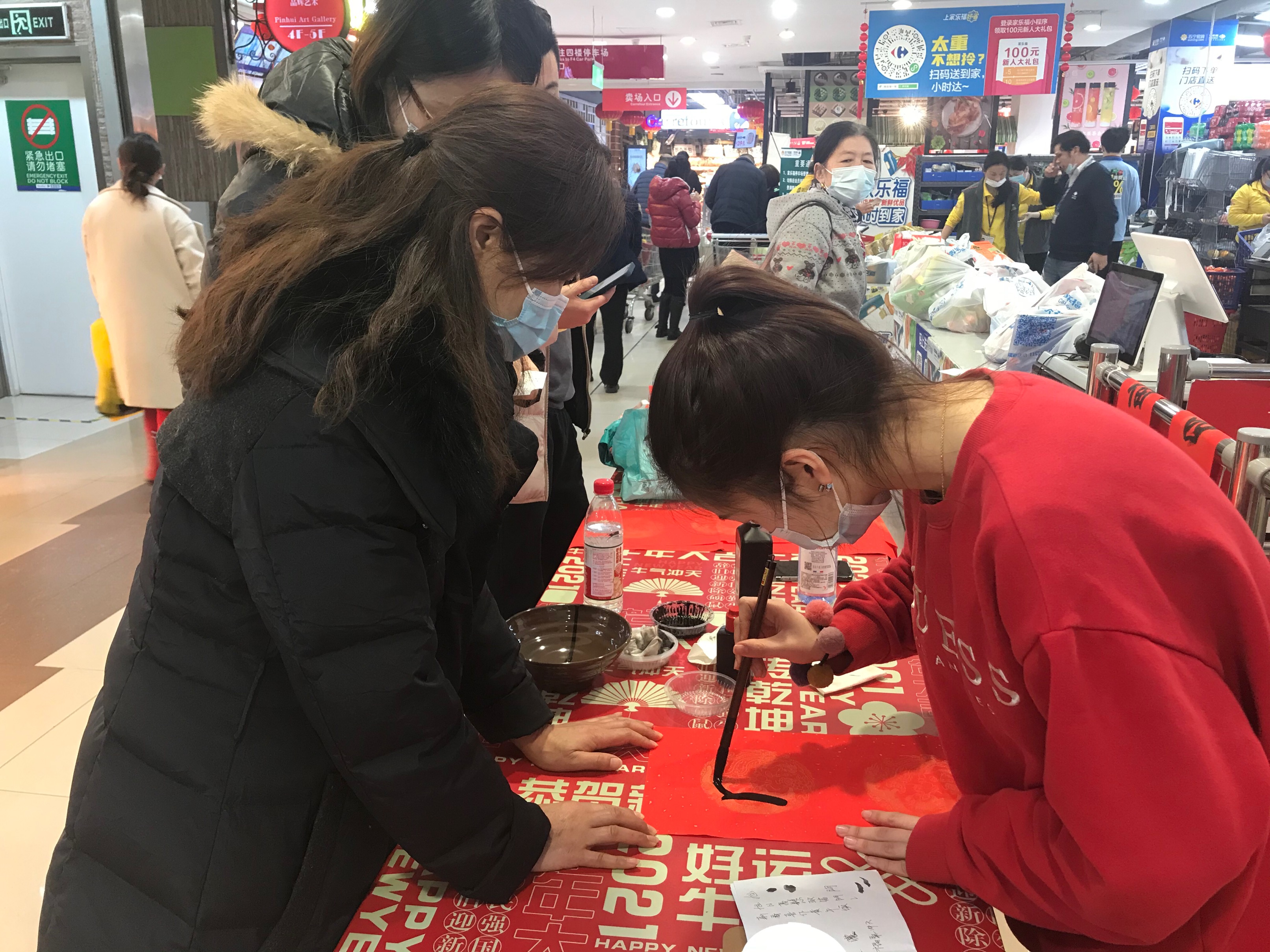 2月10日,上海长宁区的家乐福超市内,居民积极参加写春联等具有年味的活动。新华社记者周蕊摄