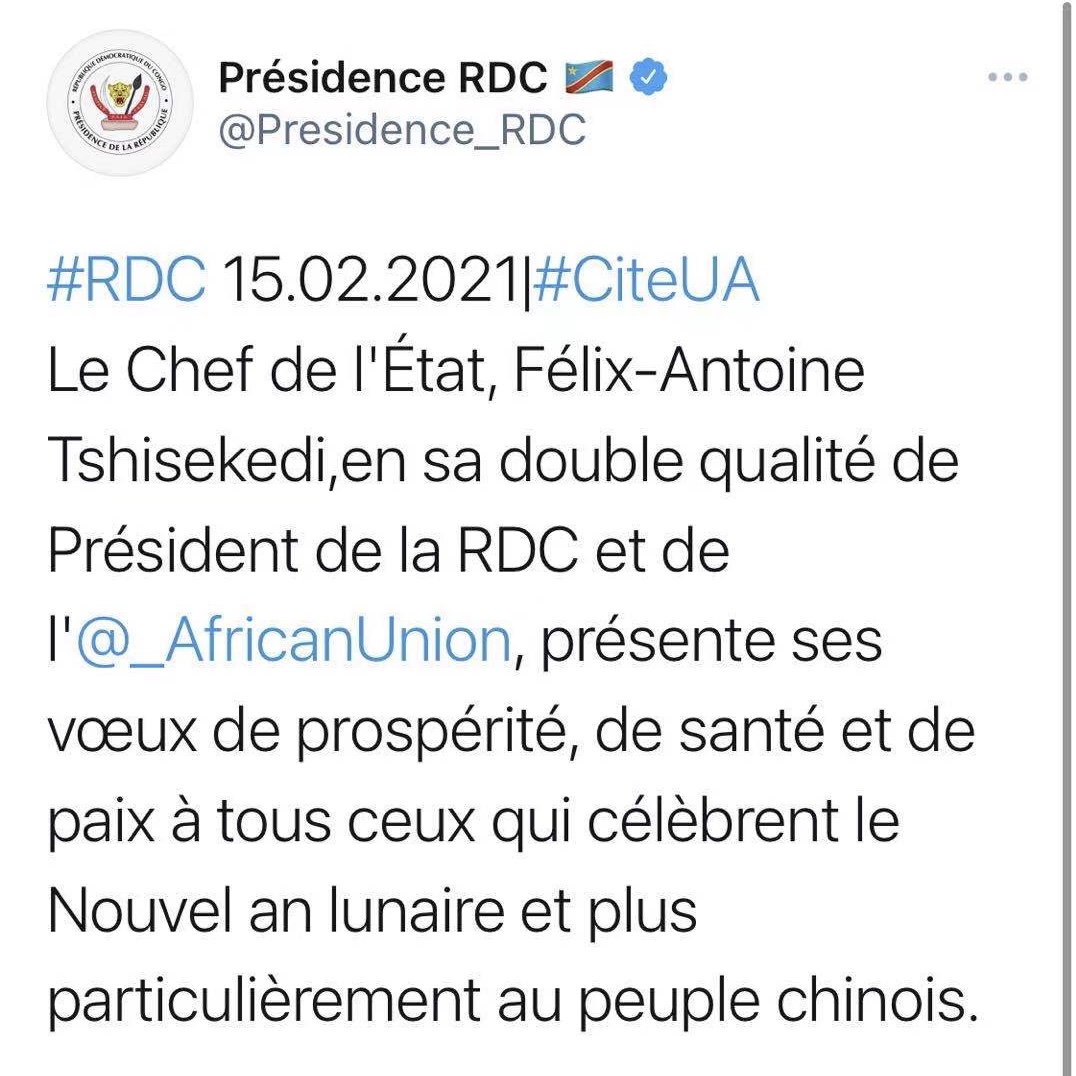 当地时间2月15日,刚果(金)总统、非盟轮值主席齐塞克迪通过社交媒体向中国人民致以新春祝福。