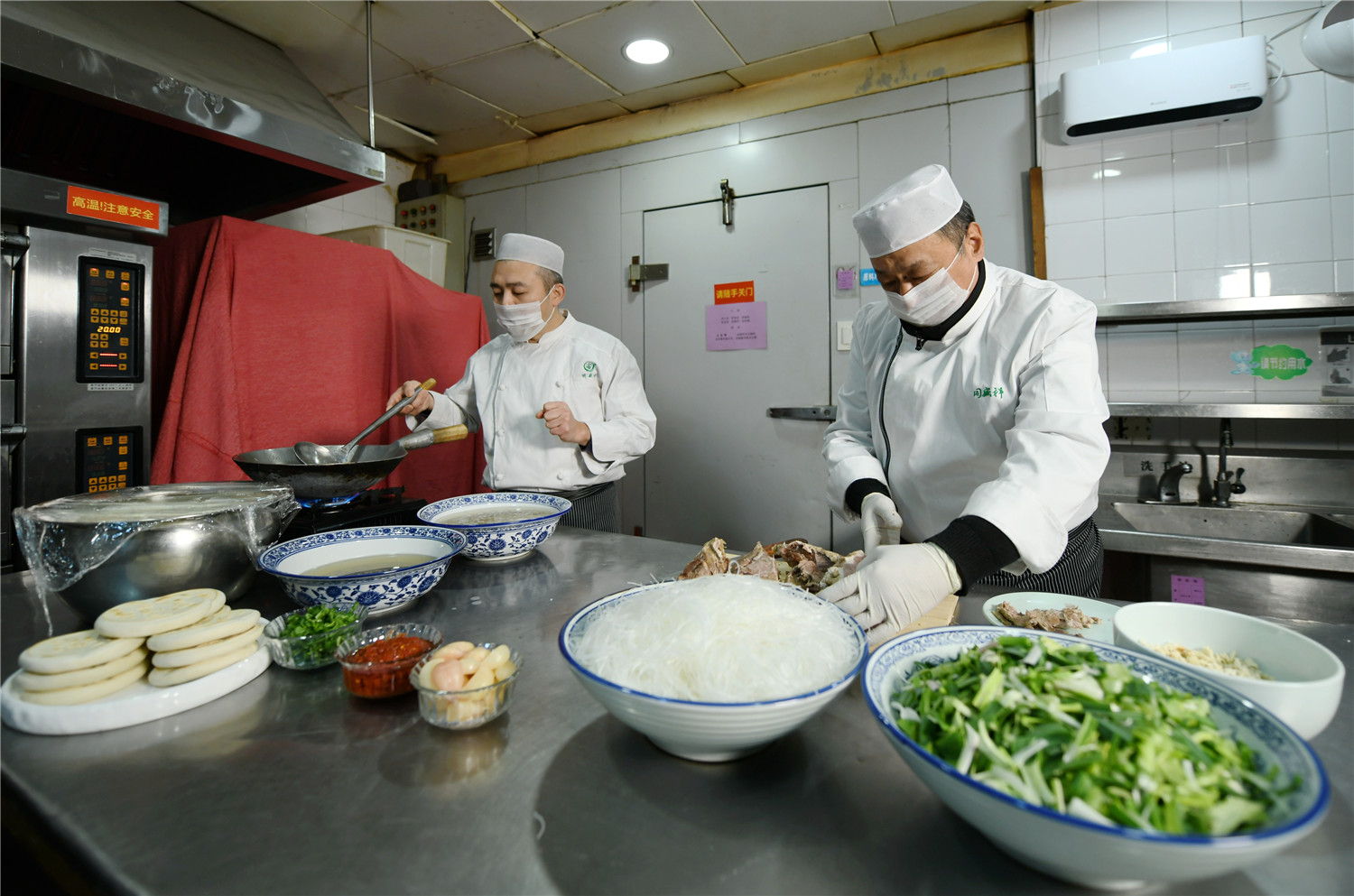 1月2日,乌平(右)和孙强在制作牛羊肉泡馍。新华社记者 李一博 摄