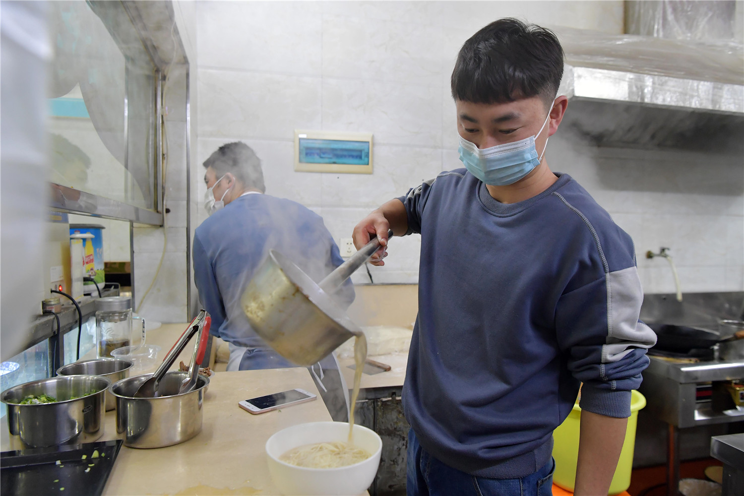 在江西省南昌市红谷滩区,韩海明正在后厨为顾客制作拉面(2月10日摄)。新华社记者 彭昭之 摄
