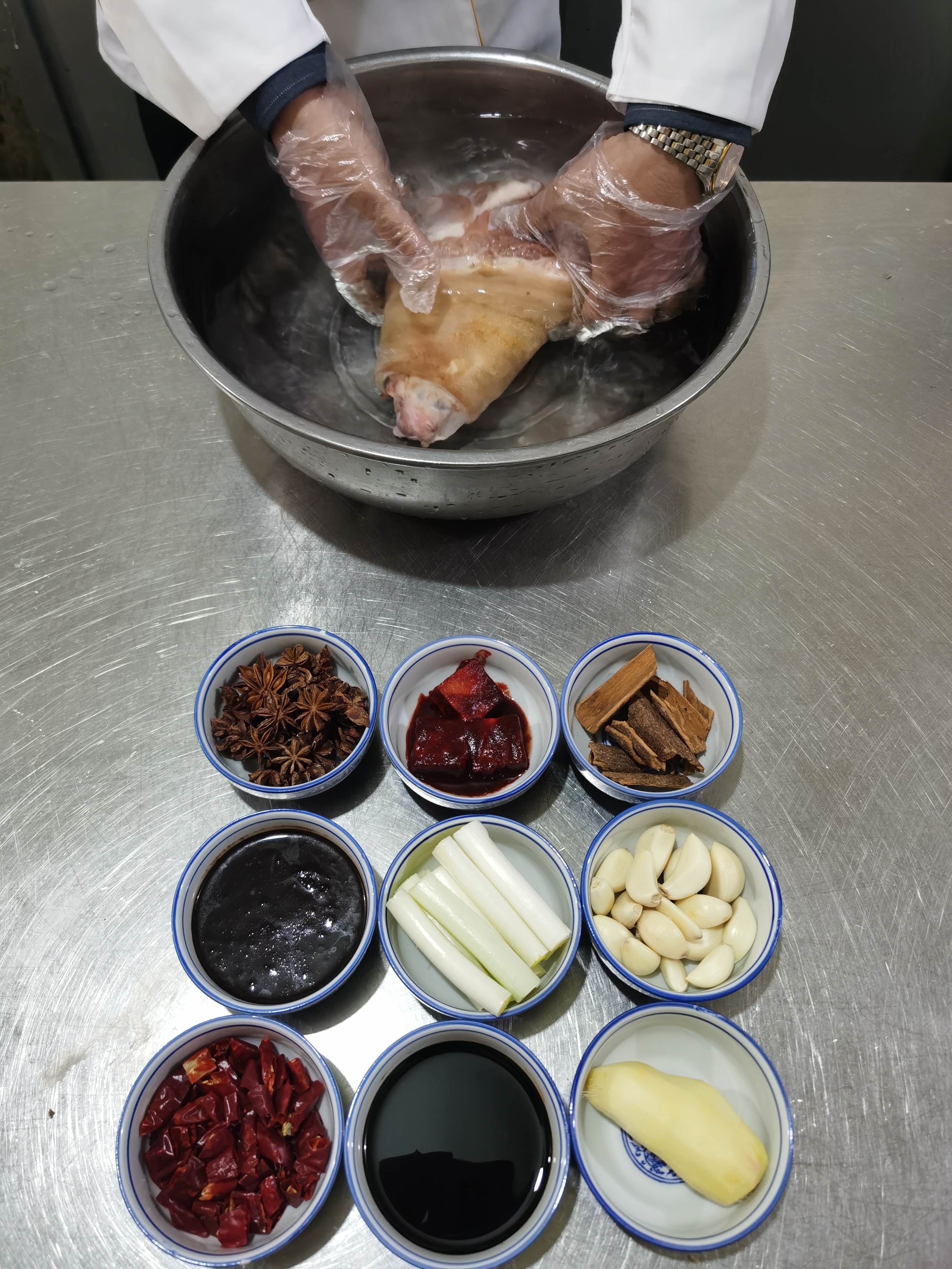 大荔县餐饮协会副会长左秦州演示了“带把肘子”的制作过程:精选约3.5斤重的猪前肘,剖皮、剔肉、斩骨之后入水断生,接着趁热涂抹酱料,与八角、桂皮等多味调料共置于蒸盆,直到诸多滋味在武蒸文焖中渗入皮肉。