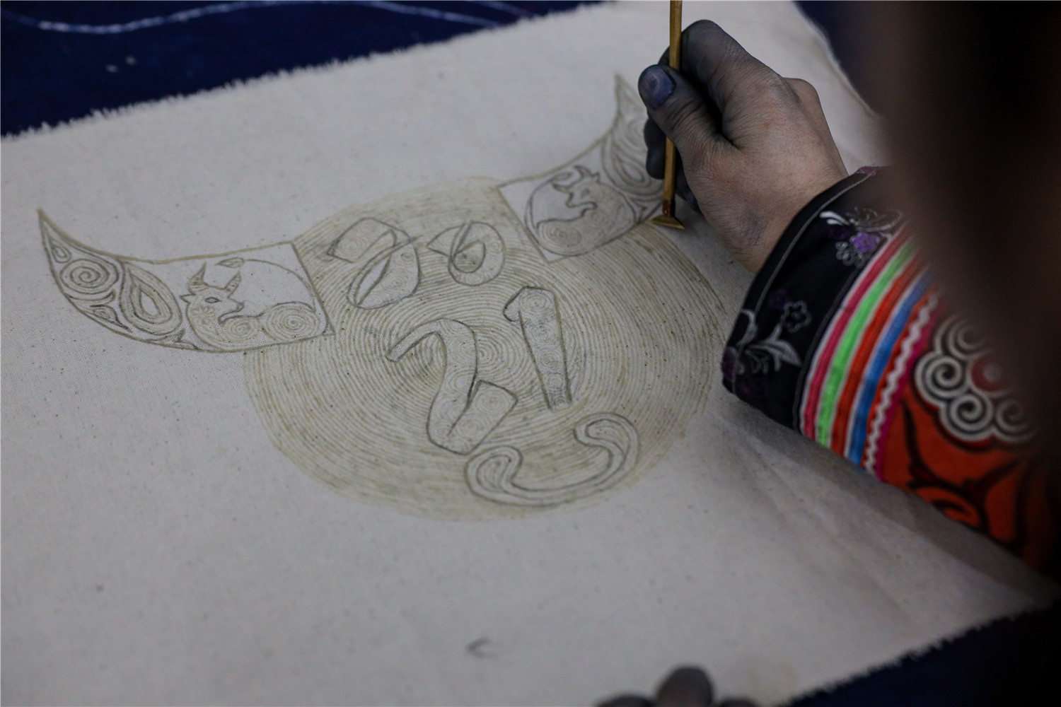 2月3日,苗族蜡染师彭艺在化屋扶贫车间内制作牛年贺岁主题的蜡染。新华社记者 欧东衢摄