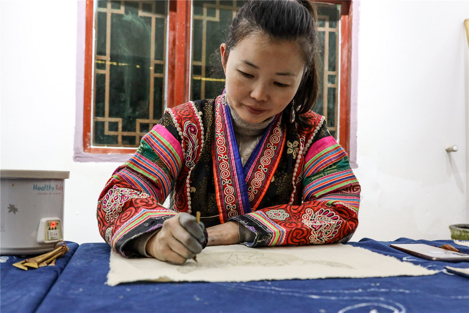 2月3日,苗族蜡染师彭艺在化屋扶贫车间内绘制蜡染。新华社记者 欧东衢摄