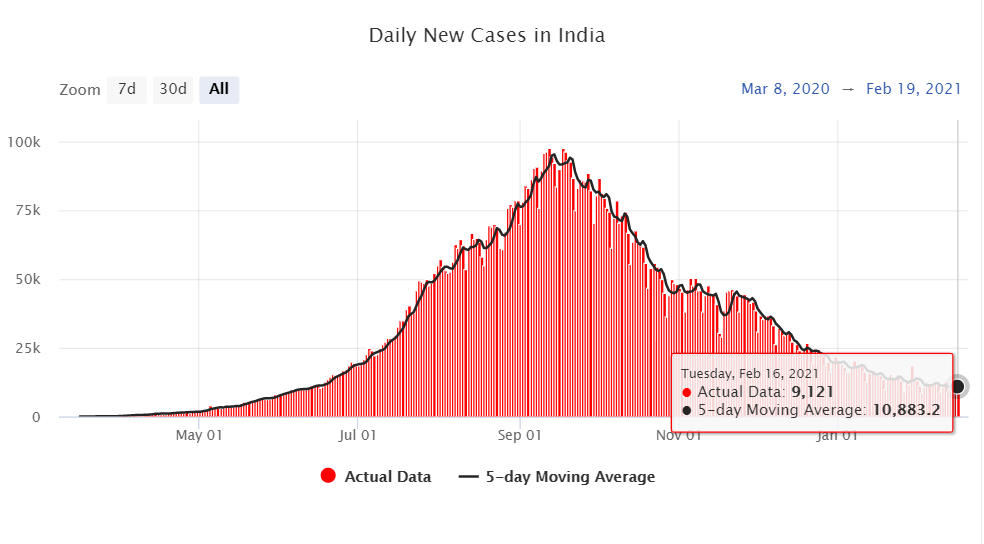 当地时间16日8时(北京时间10时30分),印度卫生部发布消息称,印度新冠肺炎确诊病例达10925710例,其中,死亡病例155813例,治愈出院10633025例,现存病例136872例。24小时内新增确诊病例9121例,新增死亡病例81例,现存病例减少2765例。目前,马哈拉施特拉邦和喀拉拉邦的新增确诊病例数占印度全国新增确诊病例数的69%。
