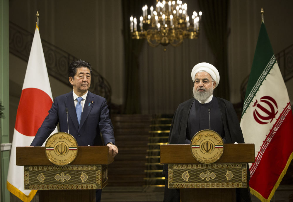2019年6月12日,在伊朗首都德黑兰,伊朗总统鲁哈尼(右)与到访的时任日本首相安倍晋三在会谈后出席联合记者会。(新华社发,艾哈迈德·哈拉比萨斯摄)
