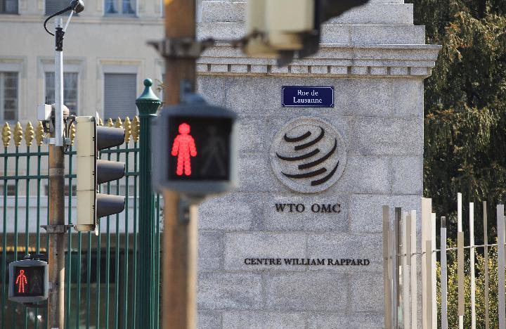 这是2019年4月2日拍摄的位于瑞士日内瓦的世贸组织总部大门上的世贸标志。(新华社记者徐金泉摄)
