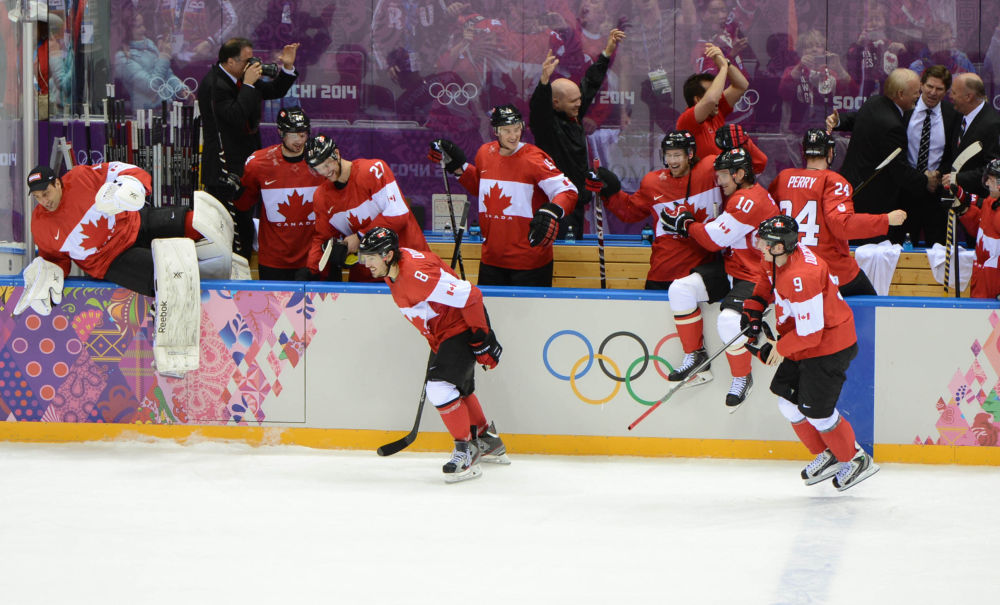 2014年2月23日,加拿大队替补球员赛后进场庆祝胜利。当日,在2014年索契冬奥会男子冰球决赛中,加拿大队以3比0战胜瑞典队,夺得冠军。(新华社记者王毓国摄)