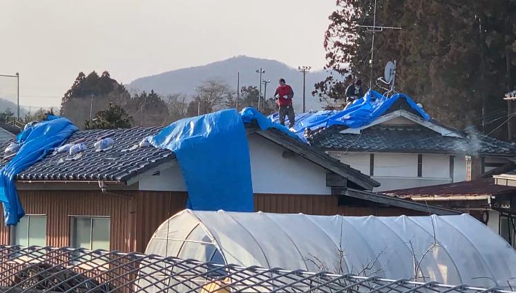 因地震后东北地区出现降雨、降雪、强风等极端天气,不少居民为屋顶罩上了防雨膜,防止漏雨。