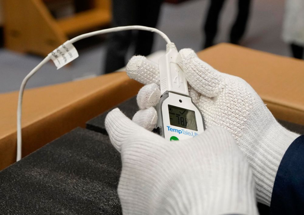 2月16日,工作人员在日本东京的一所医院内递交疫苗时测量温度。新华社发(间山公雅摄)