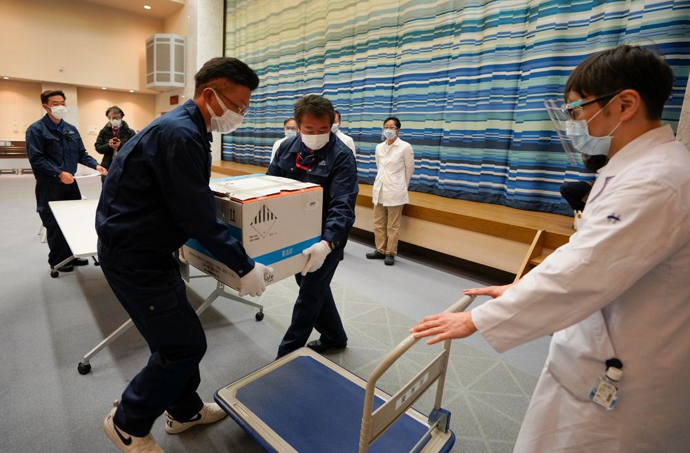 2月16日,工作人员在日本东京的一所医院内搬运疫苗。新华社发(间山公雅摄)