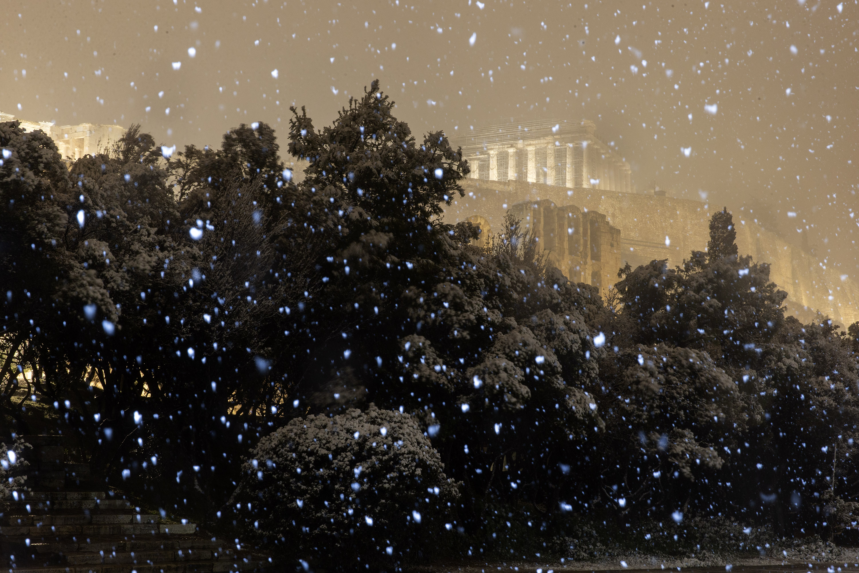 雅典属地中海气候,降雪非常罕见,尤其是大雪。一些雅典居民或站在阳台,或走上街头,拍照记录雪景。