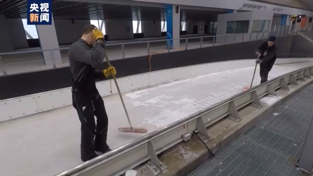 这里是国家雪车雪橇中心的1号出发区,也就是相当于“龙头”的位置,现在制冰师正在赛道上修整冰面,为即将到来的测试活动做准备。