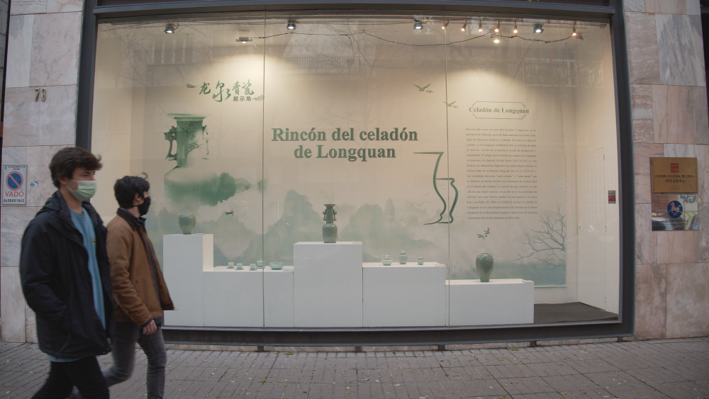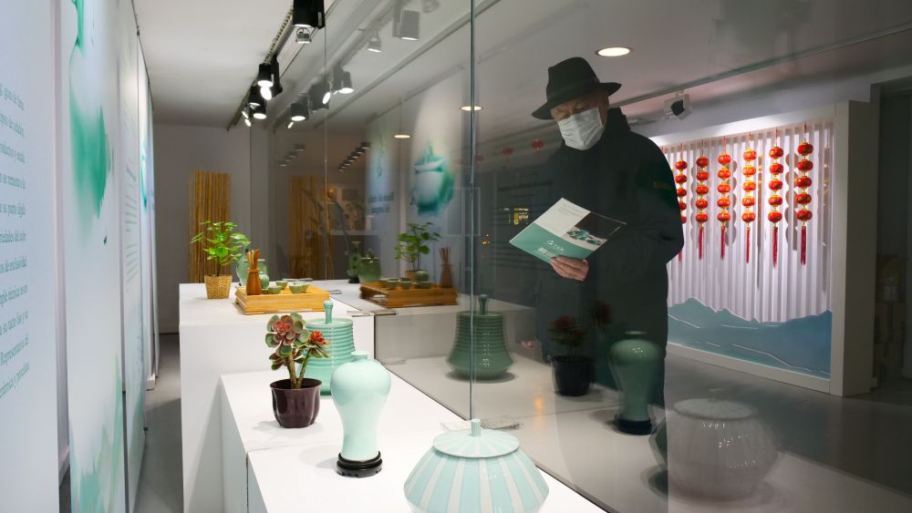 行人走过位于马德里中国文化中心的龙泉青瓷展示角。马德里中国文化中心供图