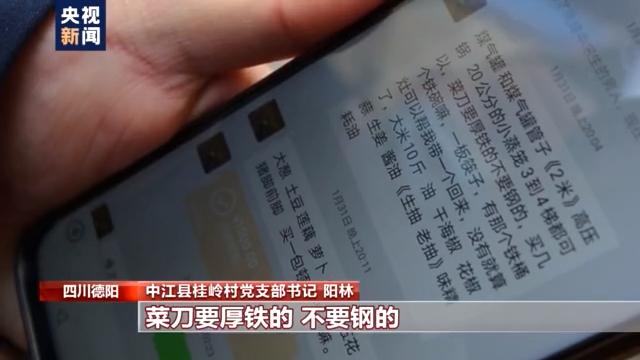 中江县桂岭村党支部书记 阳林:感觉自己像代购,买的东西很零碎,比如买的有煤气罐,煤气管子两米,高压锅,小蒸笼3到4屉,菜刀要厚铁的不要钢的,肉要五花,猪脚还要前脚。