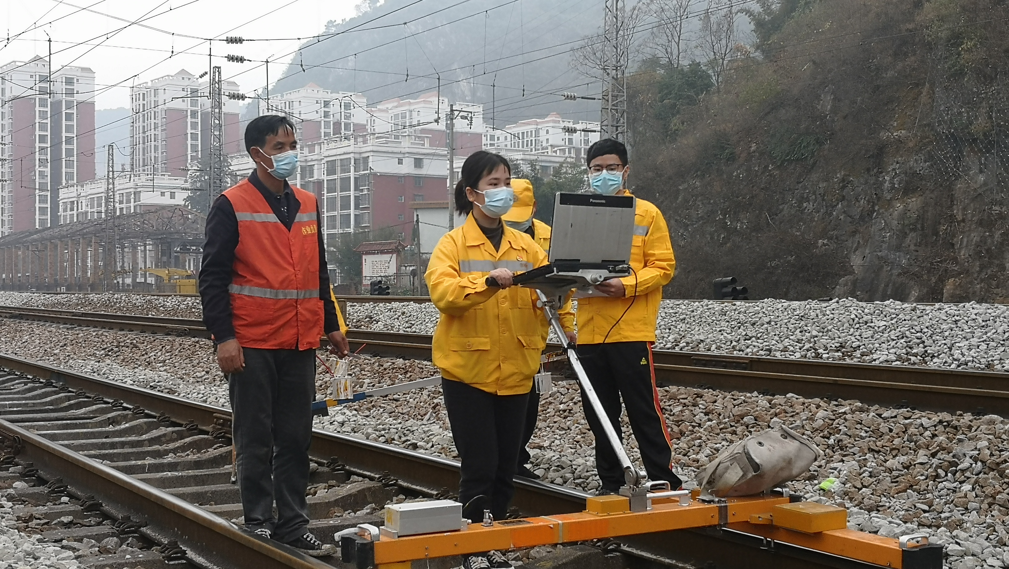 谭春丽和同事在对线路进行检查。(柳州工务段金城江线路车间供图)