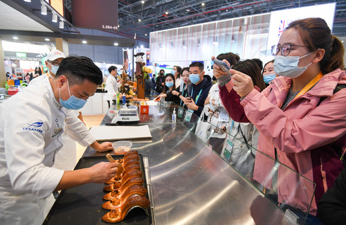 乐斯福工作人员在进博会上制作“高跟鞋”面包。 新华社记者 陈晔华 摄