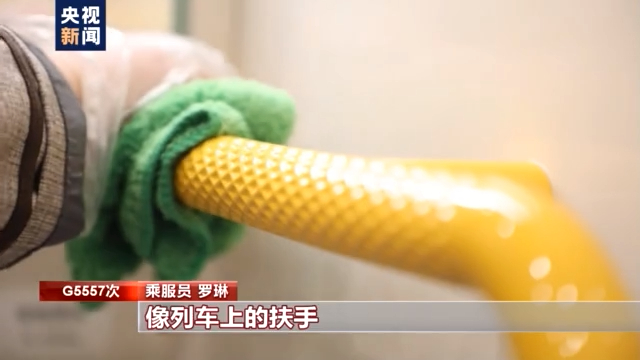 乘服员 罗琳:像列车上的扶手,还有按钮、水龙头,只要是旅客能接触到的地方,我们都要进行2小时一次的消毒,以保证旅客的放心使用,我们心里也踏踏实实的。