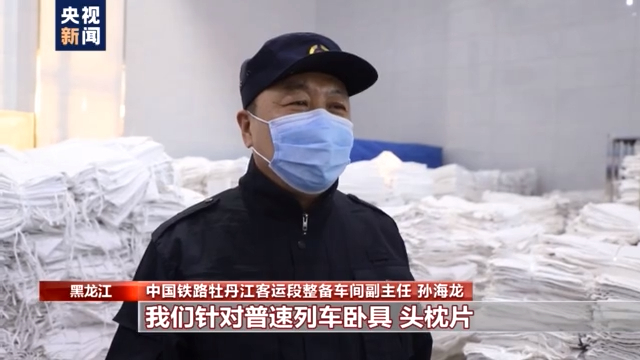 中国铁路牡丹江客运段整备车间副主任 孙海龙:我们对普速列车卧具、头枕片、台布以及动车组列车头枕片等物品回收后要先消毒。洗涤的时候,还要多加入消毒片,保障再次使用时干净无菌。