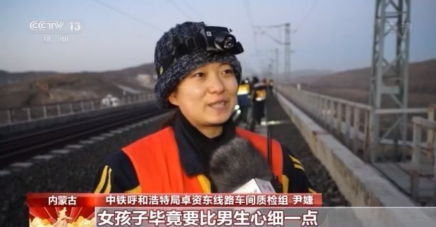 中铁呼和浩特局卓资东线路车间质检组 尹婕:女孩子毕竟要比男生心细一点,然后可能在这方面还是比较有优势的,就比如说我们上线路检查东西的时候,有时候比较较真、比较看得细,然后就能看出来。