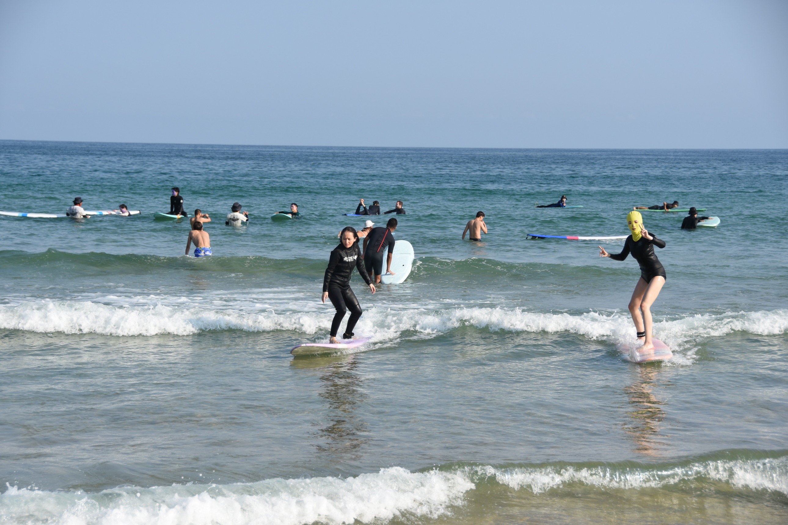 春节期间的日月湾阳光明媚,较小的浪况适合初学者体验冲浪。在沙滩上,新手冲浪客们踏着浪板在模拟练习,身后时不时会有刚到的冲浪客抱着浪板冲入大海,加入“逐浪大军”的队伍。
