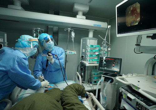 2020年3月17日,在武汉火神山医院,重症医学一科的医生在给患者实施气管镜下痰液清理。新华社记者王毓国摄