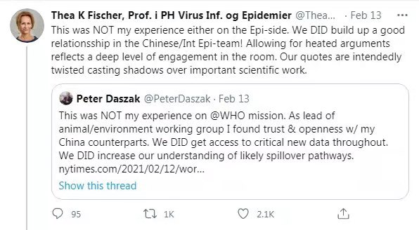 另一名出现在《纽约时报》报道中的世卫专家、丹麦哥本哈根大学教授塞娅·菲舍尔在推特上转发达萨克的推文说:“这也不是我在流行病学小组的经历……我们说的话被故意歪曲,这为重要的科学工作蒙上阴影。”她还表示,要建立信任必须要忠于事实。“请停止这种关于‘无法获得原始数据’的负面说法!”