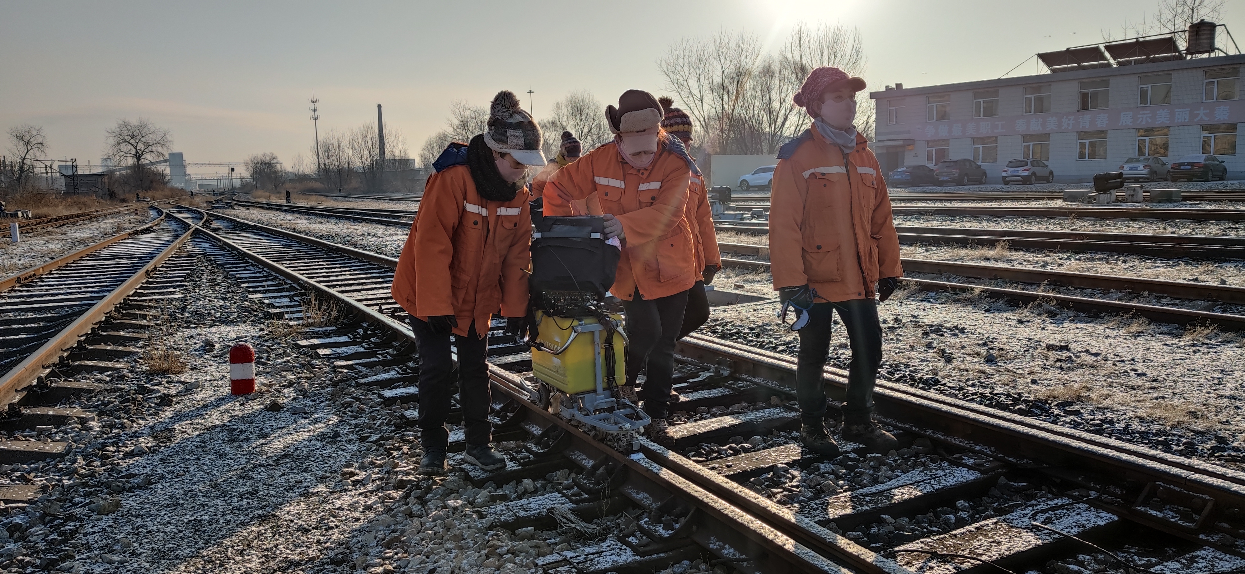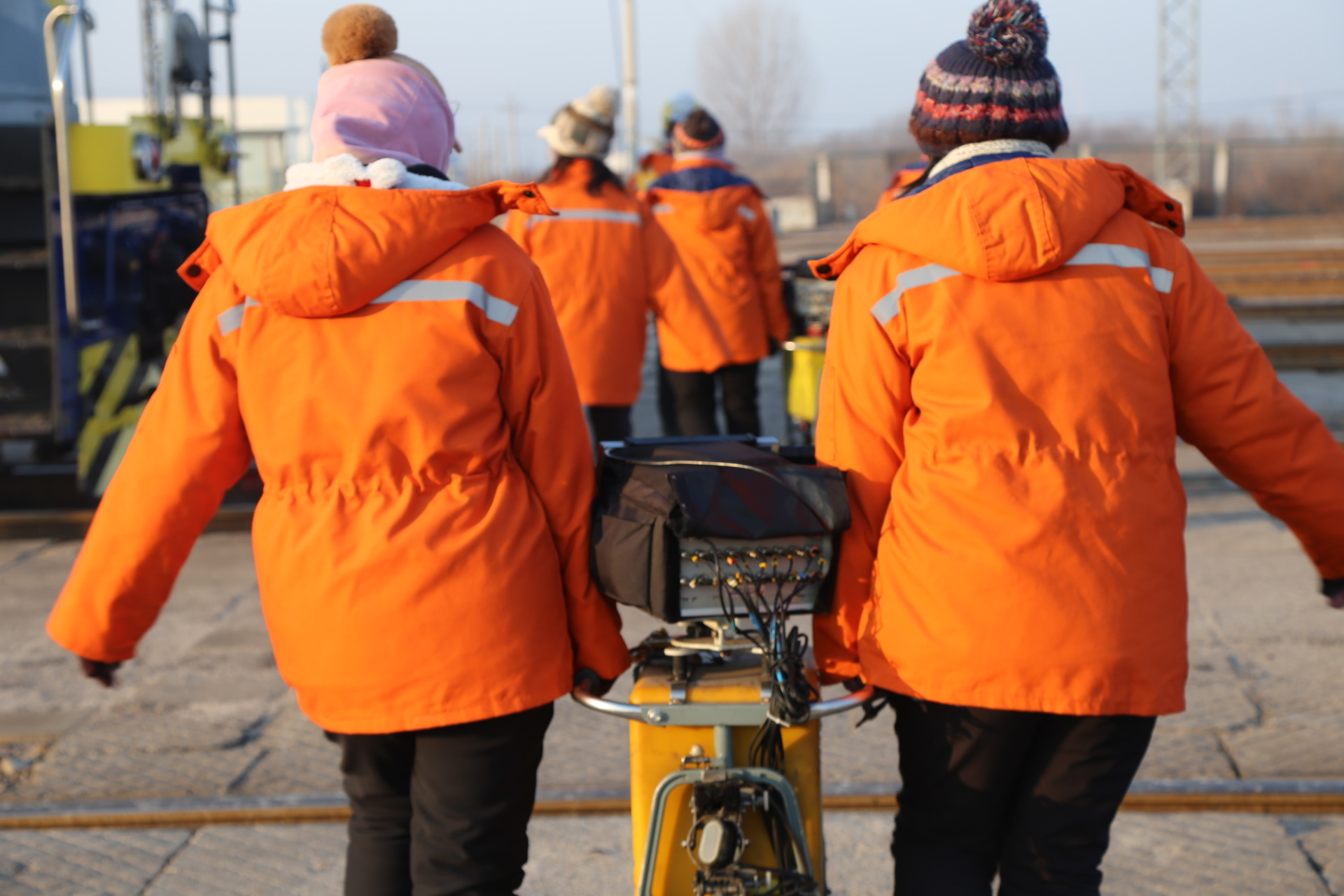 浓重的煤烟被风扬起。震耳欲聋的轰鸣声中,身着橙色工装,口罩帽子全副武装的女子探伤队员们排成一列,直至列车驶过,再将沉重的仪器搬回铁轨上,继续向前推行。