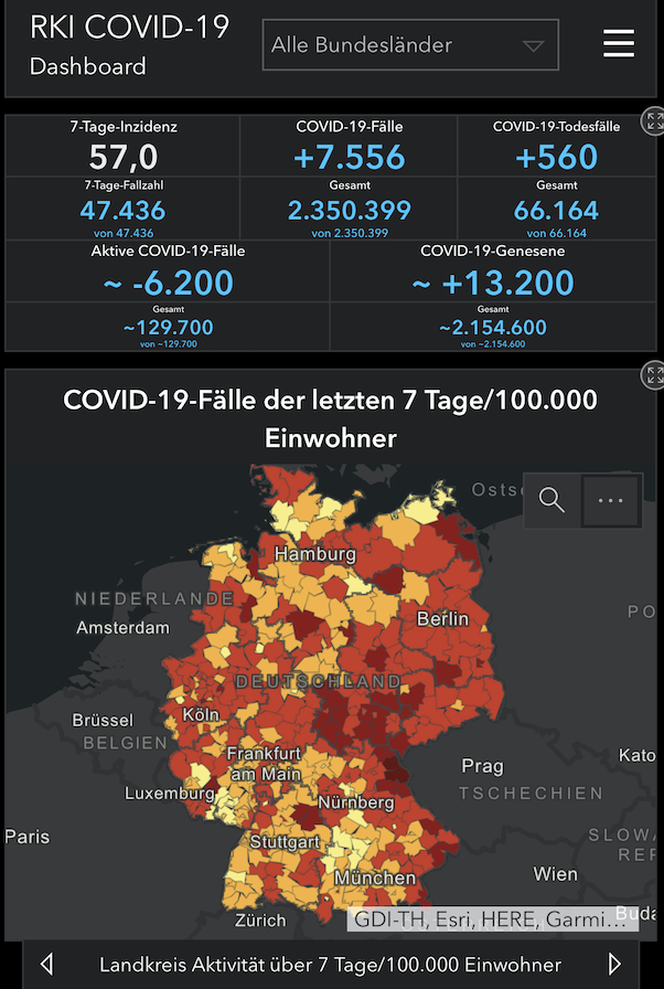根据德国联邦疾控机构罗伯特·科赫研究所发布的最新数据,截至当地时间2月17日0时,德国累计确诊新冠肺炎病例2350399例,较前一日新增确诊病例7556例;累计死亡66164例,较前一日新增560例。