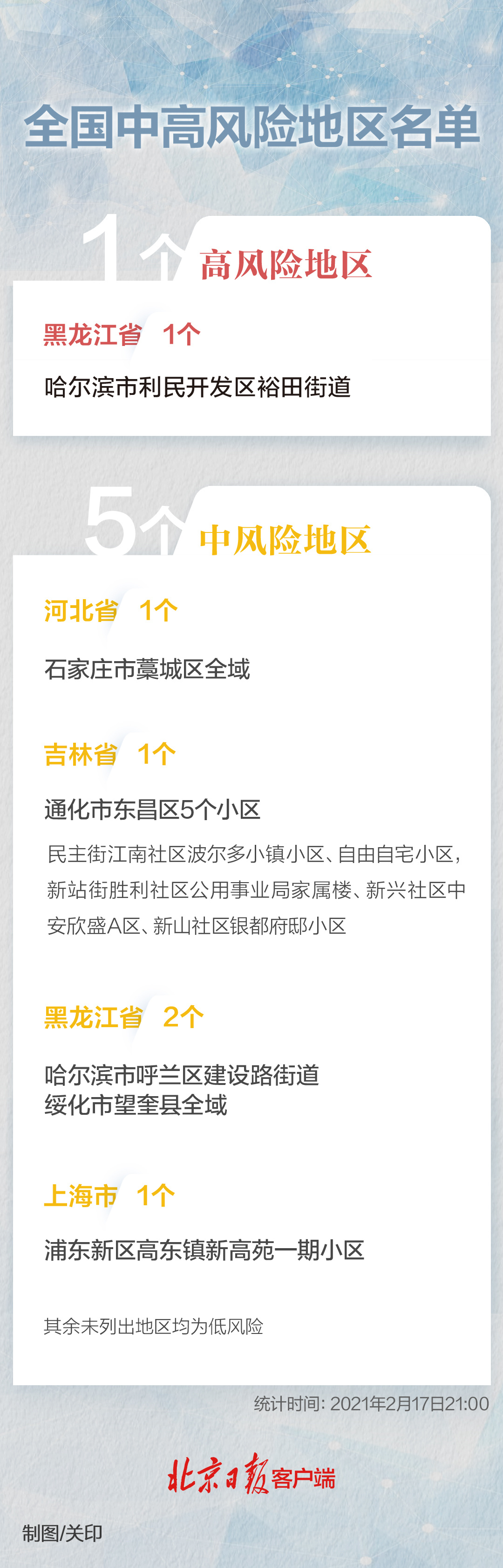 目前,全国仅剩1个高风险地区,在黑龙江省哈尔滨市;5个中风险地区,分布在4省市。