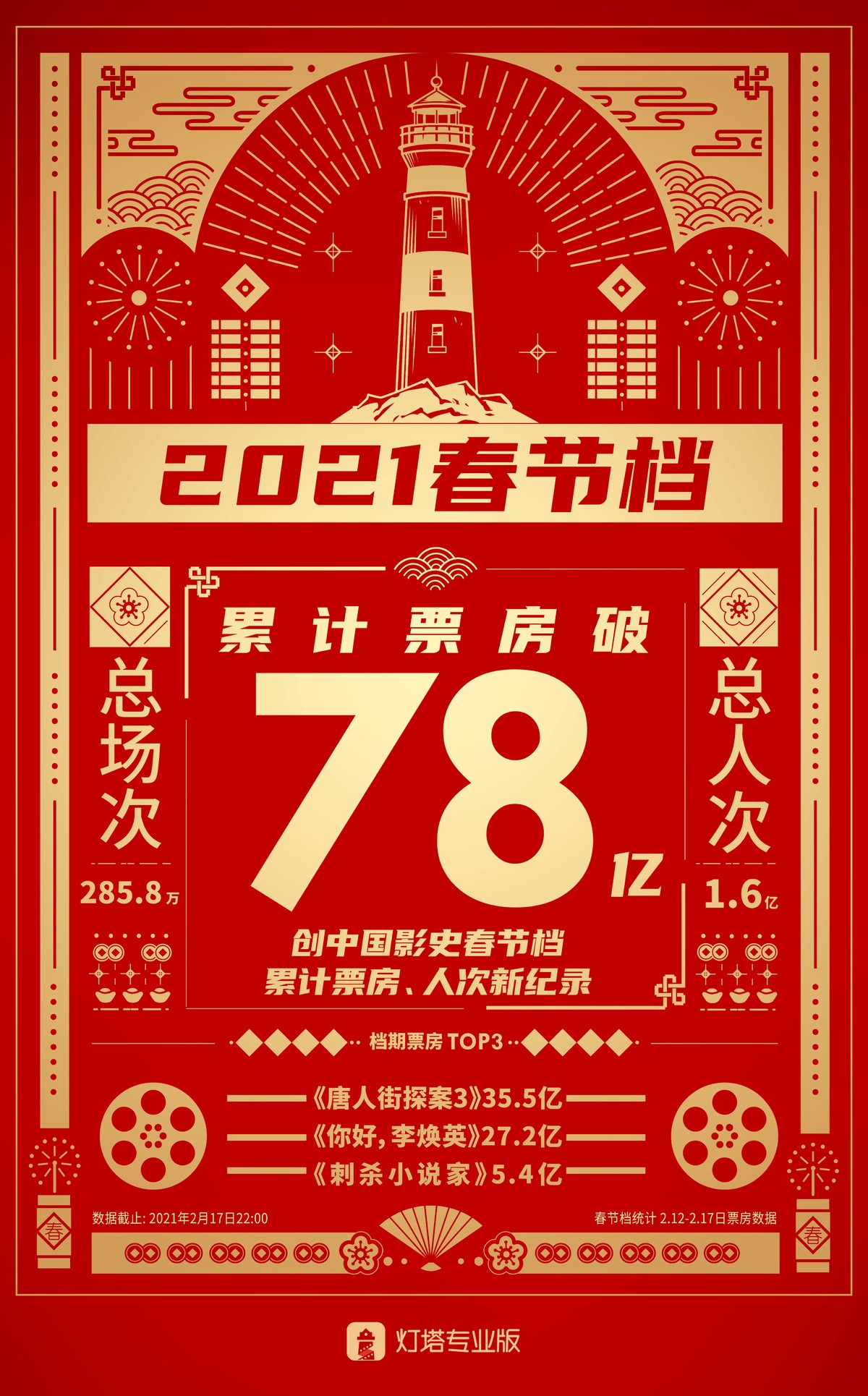 根据灯塔专业版实时数据,截至2月17日22时,2021年春节档总票房累计超78亿,总观影人次1.6亿,累计场次285.8万,创中国影史春节档累计票房、人次新纪录。其中档期内票房排名前三为《唐探3》35.5亿、《你好,李焕英》27.2亿、《刺杀小说家》5.4亿。