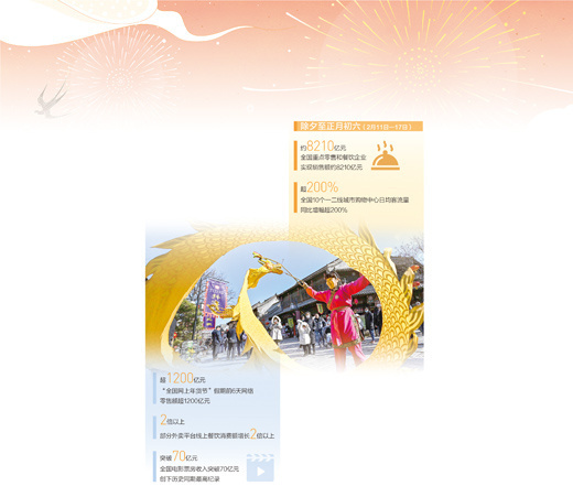 春节是观察中国经济活力的一个重要窗口。春节黄金周期间,非接触、少聚集安全消费成为共识,预约制、错峰式休闲度假广受推崇,居家购物、网上过节、到家服务、近郊游玩等多层次、多样化的品质型、升级型消费需求集中释放。商务部发布的数据显示,除夕至正月初六(2月11日—17日),全国重点零售和餐饮企业实现销售额约8210亿元,比去年春节黄金周增长28.7%,比2019年春节黄金周增长4.9%。