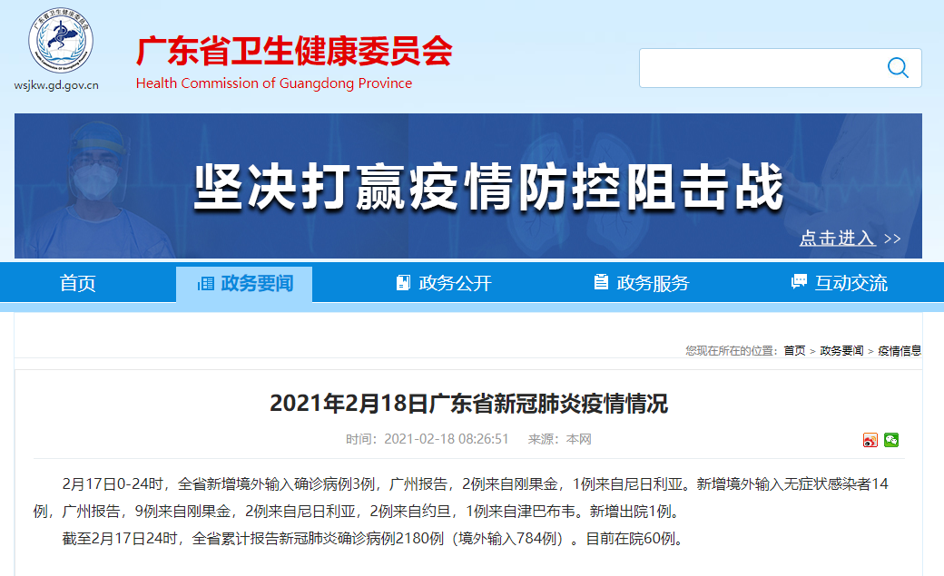 截至2月17日24时,广东省累计报告新冠肺炎确诊病例2180例(境外输入784例)。目前在院60例。