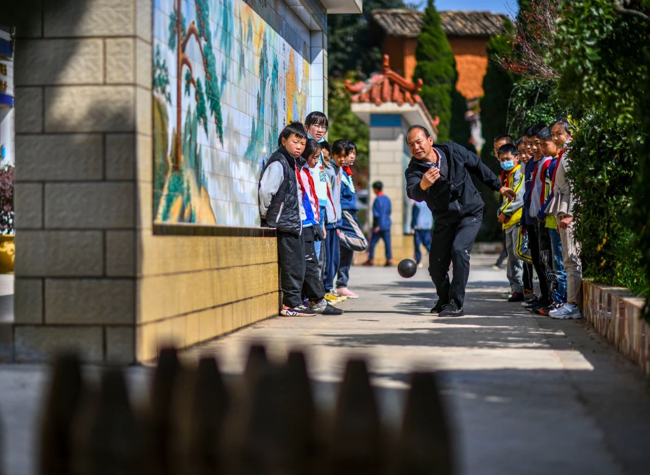 毕首金和孩子们的新“保龄球” 新华社记者江文耀 摄