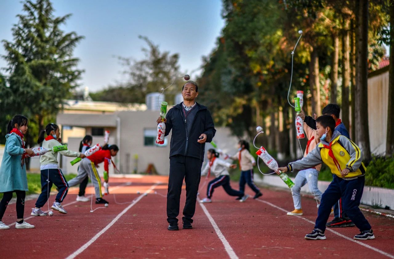 毕首金:比如给孩子做跳绳,握把处我会使用药瓶,那瓶子中间有凹槽,一二年级的孩子手小,便于他们握稳。很快,我们学校的体育器材室被填满了。只要下课铃声一响,孩子们就会来借器材。看着娃娃们课间10分钟也在流汗,我高兴!我要让农村小孩人人爱玩、个个会玩。