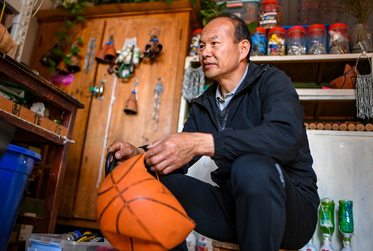 毕首金用废旧篮球制作新体育器材 新华社记者江文耀 摄