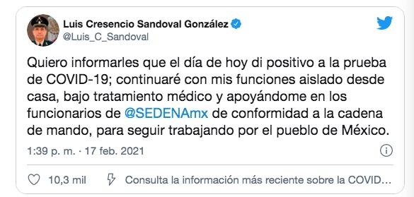 当地时间2月17日,据当地媒体报道,墨西哥国防部部长路易斯·克雷森西奥·桑多瓦尔(Luis Cresencio Sandoval )当天下午宣布,其新冠病毒检测呈阳性,将在家中远程办公,同时接受治疗。