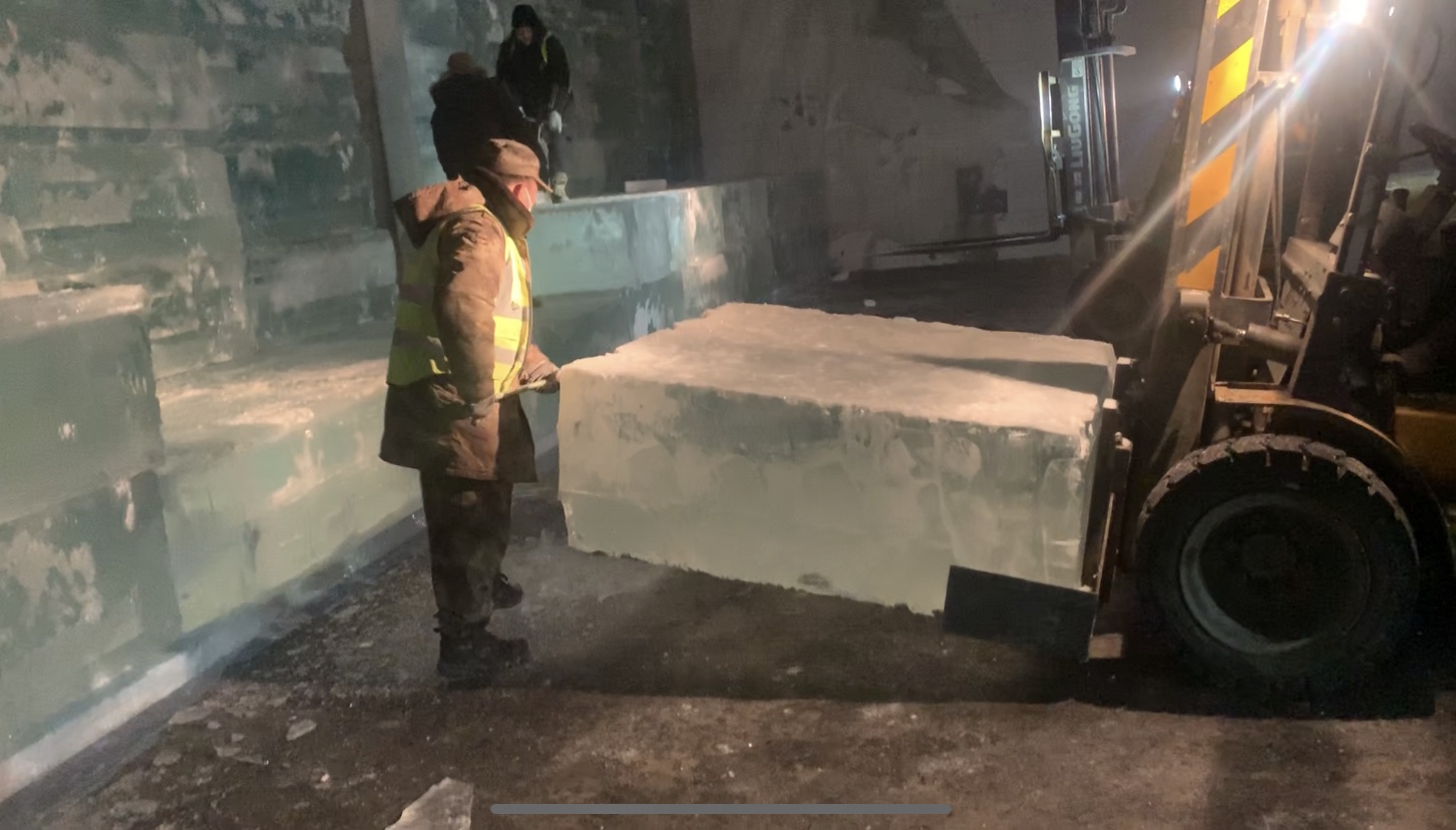 2021年1月6日,工人们搬运冰块。新华社李典 摄