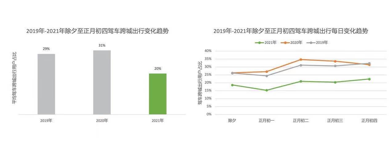 在就地过年的倡议下,2月11日到2月15日(除夕至正月初四),全国驾车跨城出行用户占比的均值较2019年、2020年同期下降明显,由2019年的29%、2020年的31%下降至20%,八成用户将活动范围控制在了本地范围内。
