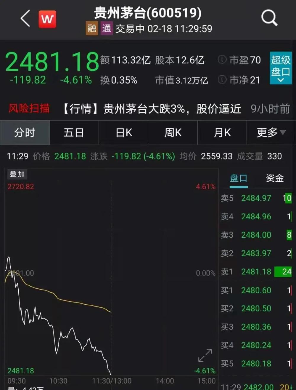 (小标题)贵州茅台跌近5%