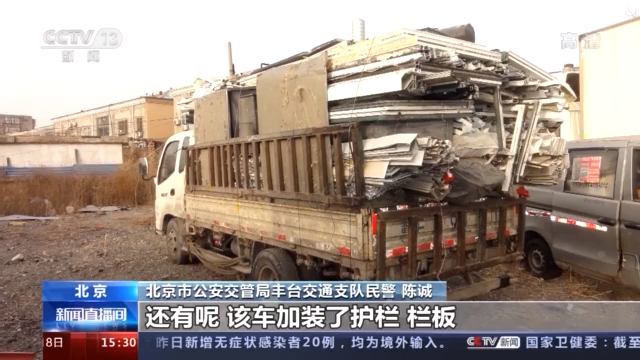 北京市公安交管局丰台交通支队民警 陈诚:后边这个号牌字迹不清晰,该车加装了护栏、栏板,放下以后挡在后边号牌上,致使号牌不容易被发现数字。然后放大号也是被遮挡,又长期没办理进京证。