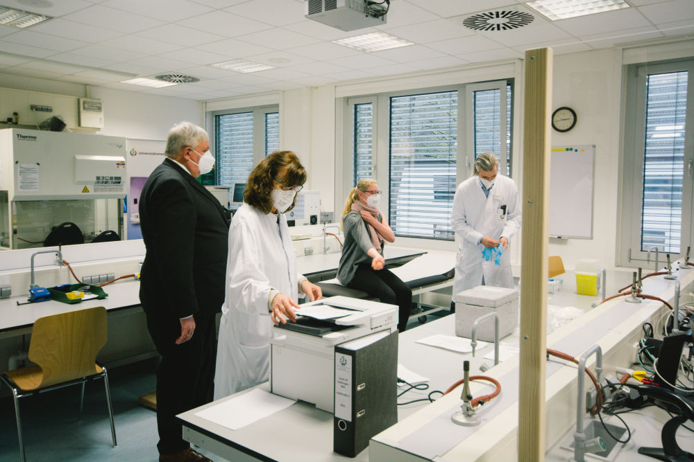 1月18日,在德国埃森大学医学院,一名医护人员(右二)准备接种新冠疫苗。(新华社发,唐颖摄)