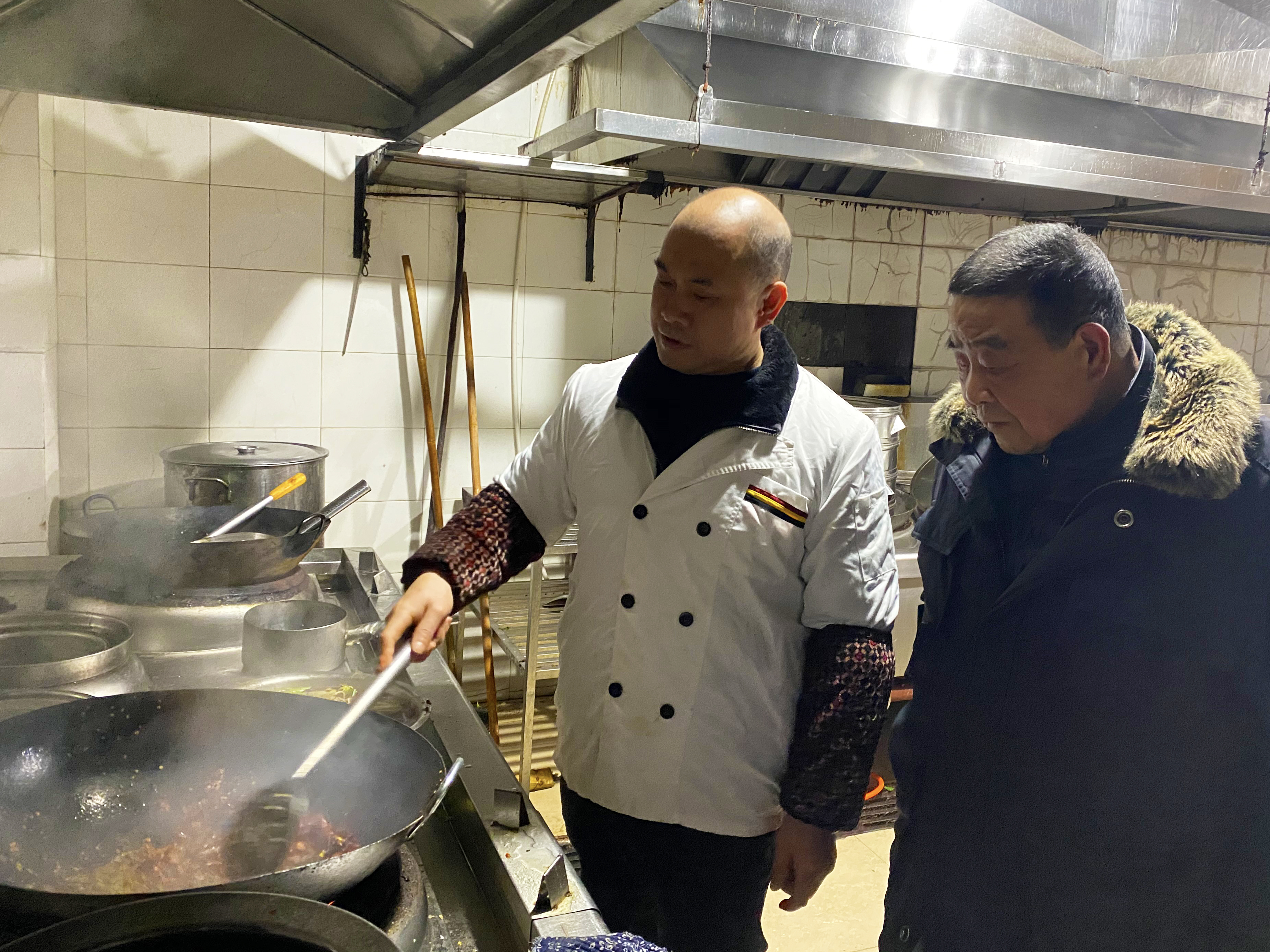 2月2日,王明庆(右一)在后厨指导徒弟陈力。新华社记者王晓曈 摄
