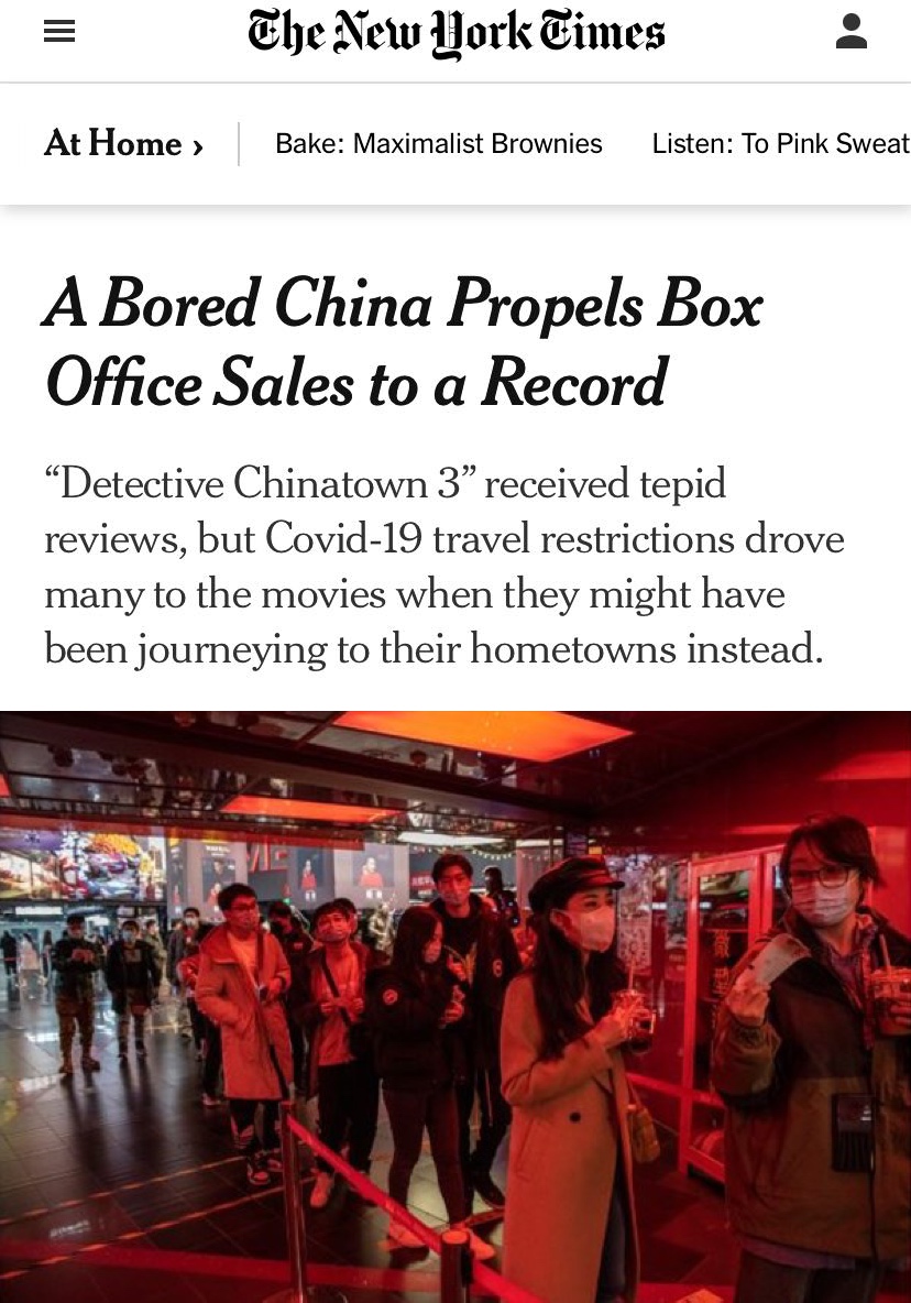 美国《纽约时报》网站也关注了中国春节档票房。报道指出,今年春节假期期间,受新冠肺炎疫情的影响,中国政府号召民众“就地过年”,这使得世界上最大规模的“年度迁徙旅行季”暂停。而与此同时,中国人走进影院推动了票房的井喷复苏。中国电影票房的强劲表现有力地提醒了人们中国消费者的力量。