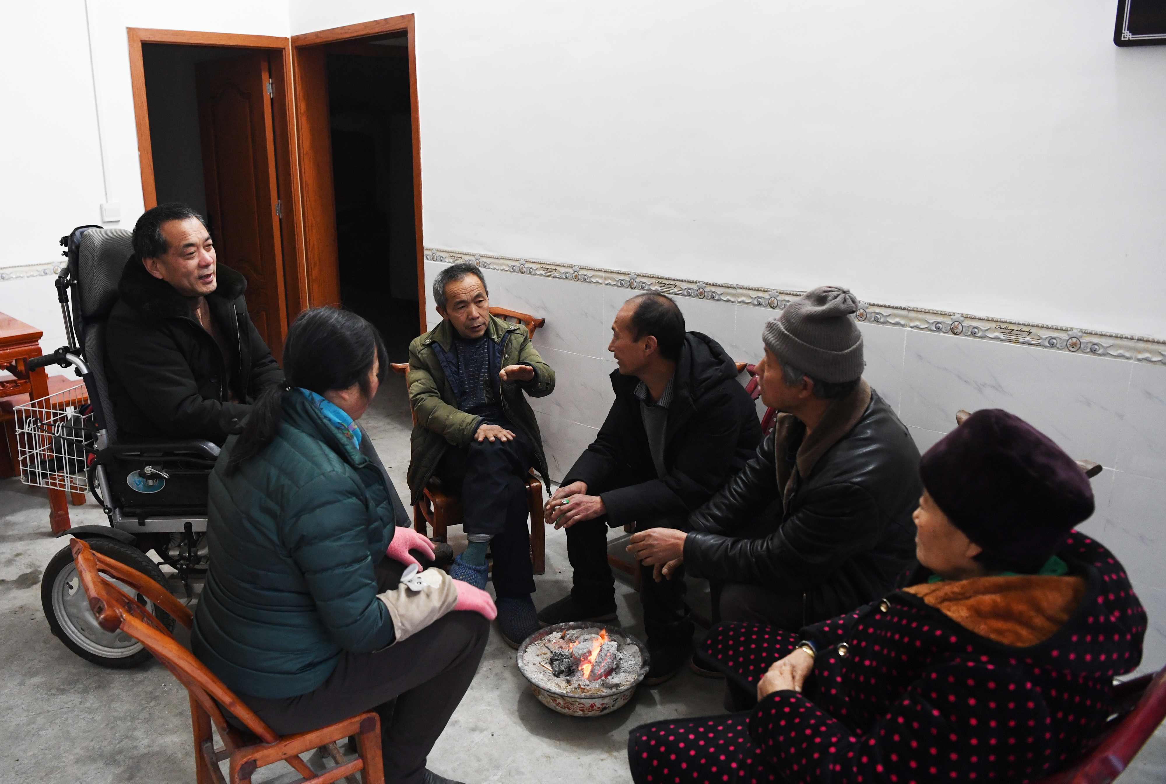 1月6日,毛相林(左三)和下庄村村民交流。新华社记者王全超 摄